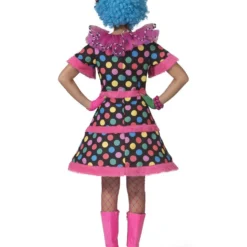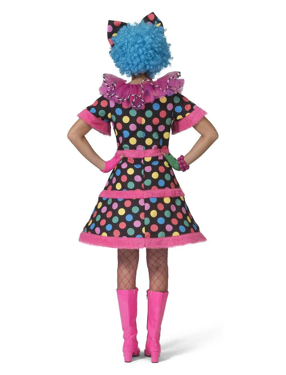 Dit prachtige kleurrijke kostuum voor vrouwen verzet iedereen makkelijk in goed humeur. De jurk heeft grote veelkleurige punten op een zwarte ondergrond. Hetzelfde patroon komt terug in de grote strik die als hoofdstuk meegeleverd word. De onderkant van de rok en de uiteinden van de korte mouwtjes zin afgewerkt met een roze pluche rand die ook om de taille en halverwege de rok terugkomt. De roze tule kraag maakt het kostuum compleet.
