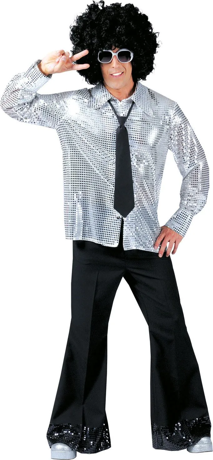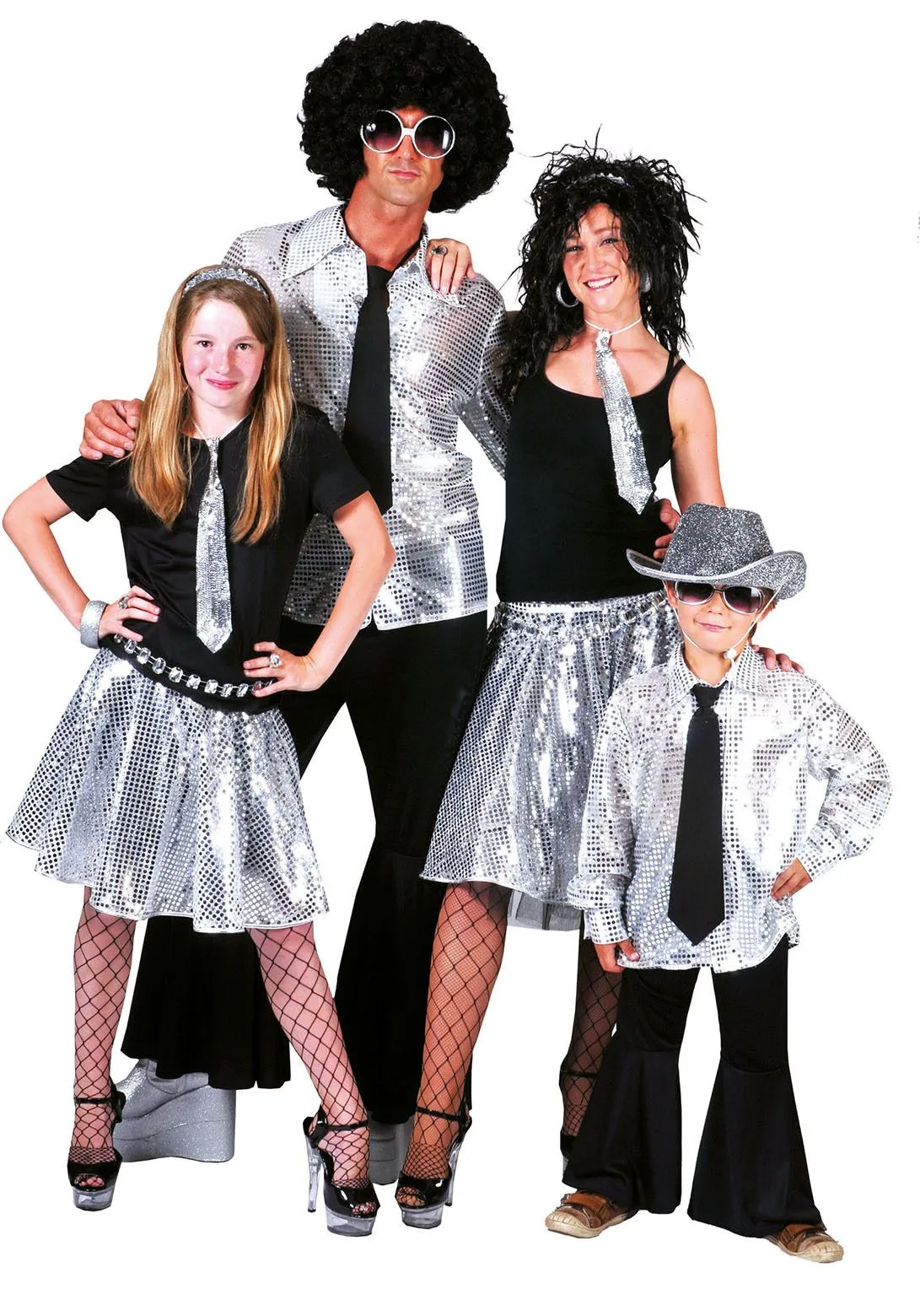 Niemand kan meer om je heen met het wijdvallende zilveren pailletten shirt. Ze kunnen niet alleen om jou heen, maar ook niet om de rest van de familie. Dit shirt is er in bijpassende variaties voor mannen, vrouwen, jongens en meisjes. Wanneer de muziekklanken uit de jaren 60 & 70 uit de boxen knallen, ben jij het voorbeeld van de jeugd van tegenwoordig. Je laat zien hoe jullie vroeger uit jullie dak gingen. De danspasjes zijn misschien wat ruw, maar jouw kostuum sprankelt als een diamant. Jij straalt door de pailletten die twinkelen in de spotlights. Samen schitteren jullie op het feestje.