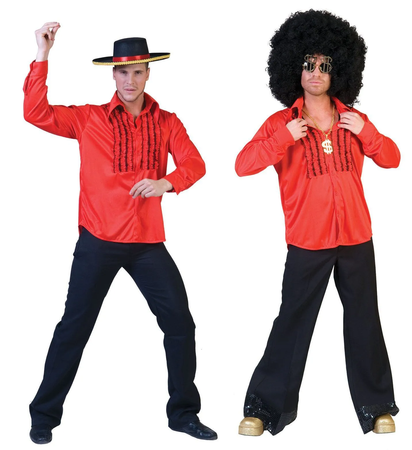 Dit Saturday Night Shirt Red kostuum heeft een Mexicaanse uitstraling. Je kunt met deze rode kleding met rouchen zo wel terecht in de disco als op een mariachi feest. We zien je zo staan, luidkeels zingend met een gitaar hoog op je borst of losjes swingend tijdens een Jaren 80 & 90 feest. Deze blouse is zelfs geschikt om een dame in zigeuner jurk bij de hand te pakken en trots een flamenco te dansen. Wat gaat het worden?