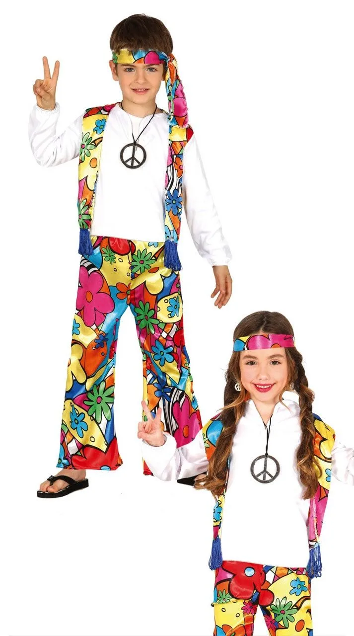Hippie kinderen waren kleine wereldreizigers en ontdekkers. Met hun bonte kleding maakten ze iedereen om zich heen blij. Nou ja, misschien dat hun papa en mama een beetje onder invloed waren. Deze 100% polyester multicolor flowerpower kleding met bloemenprint maakt jou vrolijk maar de andere feestgangers zeker weten ook! Het glanzende kostuum bestaat uit een wit shirt en bont vestje met originele franjes, een jaren 60&70 wijde pijpen broek met heel veel felgekleurde bloemen en natuurlijk de hoofdband want mensen in de hippietijd hadden allemaal lang haar. De jongens ook!