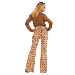 De bedekkende lange broek is van 100% polyester en heeft de authentieke seventies print die destijds veel gedragen werd en zit lekker strak om de billen. Maar niet alleen door de hippies, ook de discogangers gingen mee met deze mode. Oranje was een populaire kleur en viel lekker op in de menigte of op de dansvloer. Uiteraard heeft de broek wijde pijpen, hoe kan het ook anders, en valt dit kledingstuk mooi over je blokhakken.