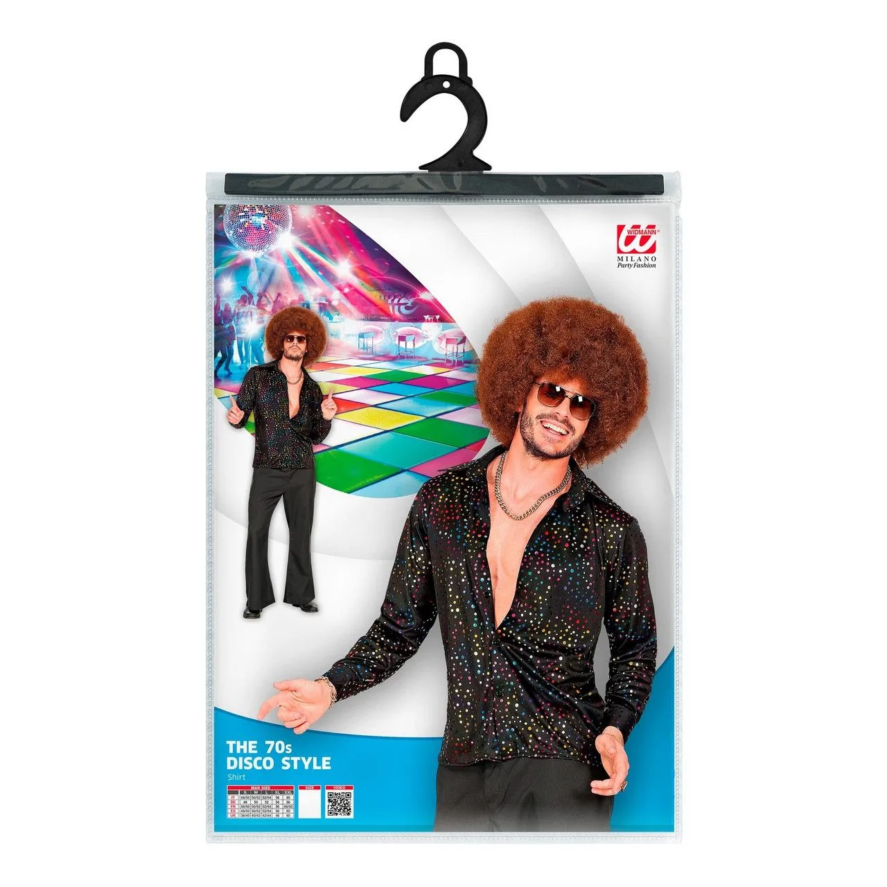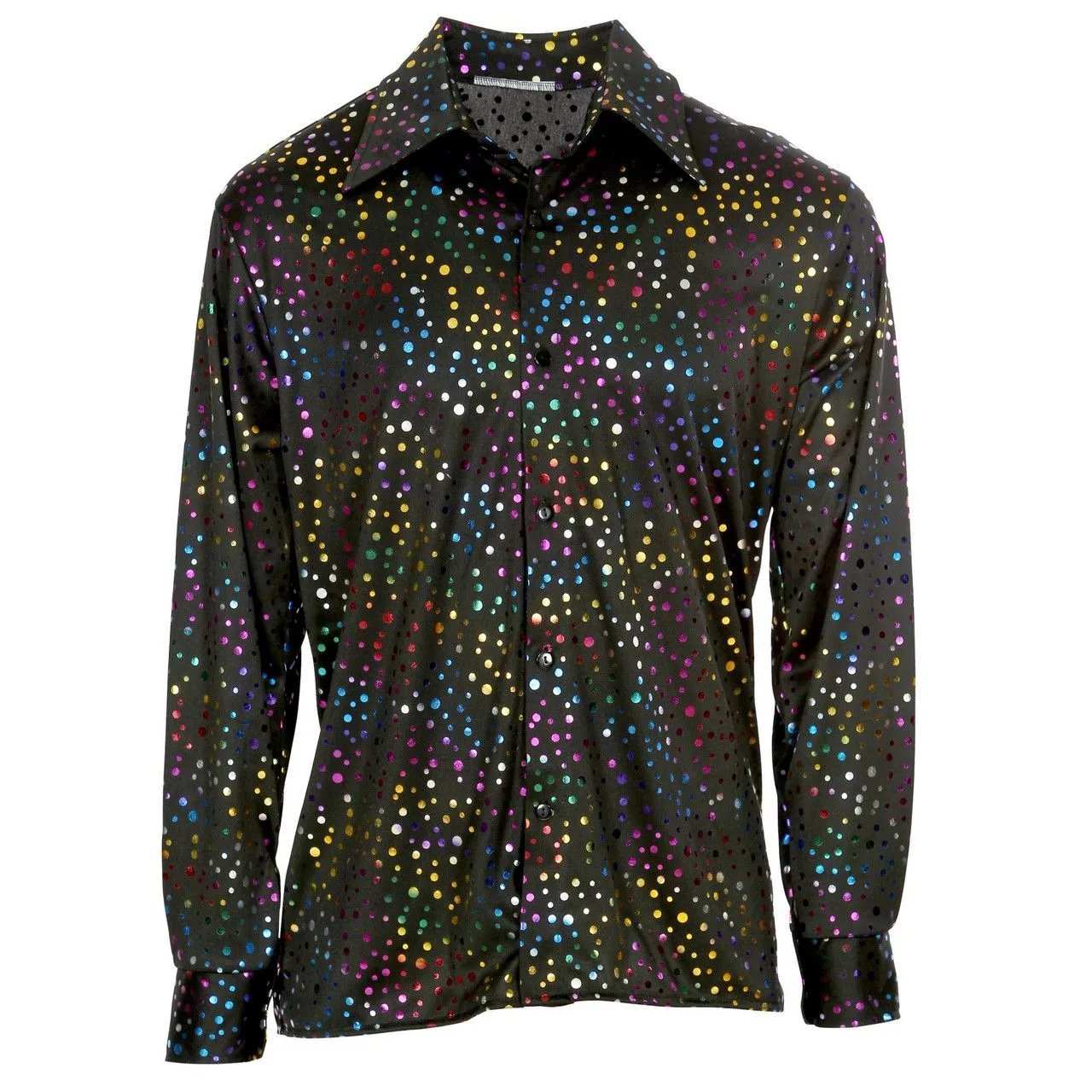 Het weekend komt er aan en jij hebt de saturday night fever opgelopen. En dat snappen wij maar al te goed! In dit zwarte shirt met multicolor glitters rock jij de ballen van het plafond. Door de gekleurde glitters op de zwarte heren blouse ziet elke beweging er groovy uit. Het maakt dus niet uit of de DJ jaren 60 & 70 muziek draait, of de uptempo beats van de jaren 80 & 90. Als een echte soulman weet jij elk ritme te verslaan!