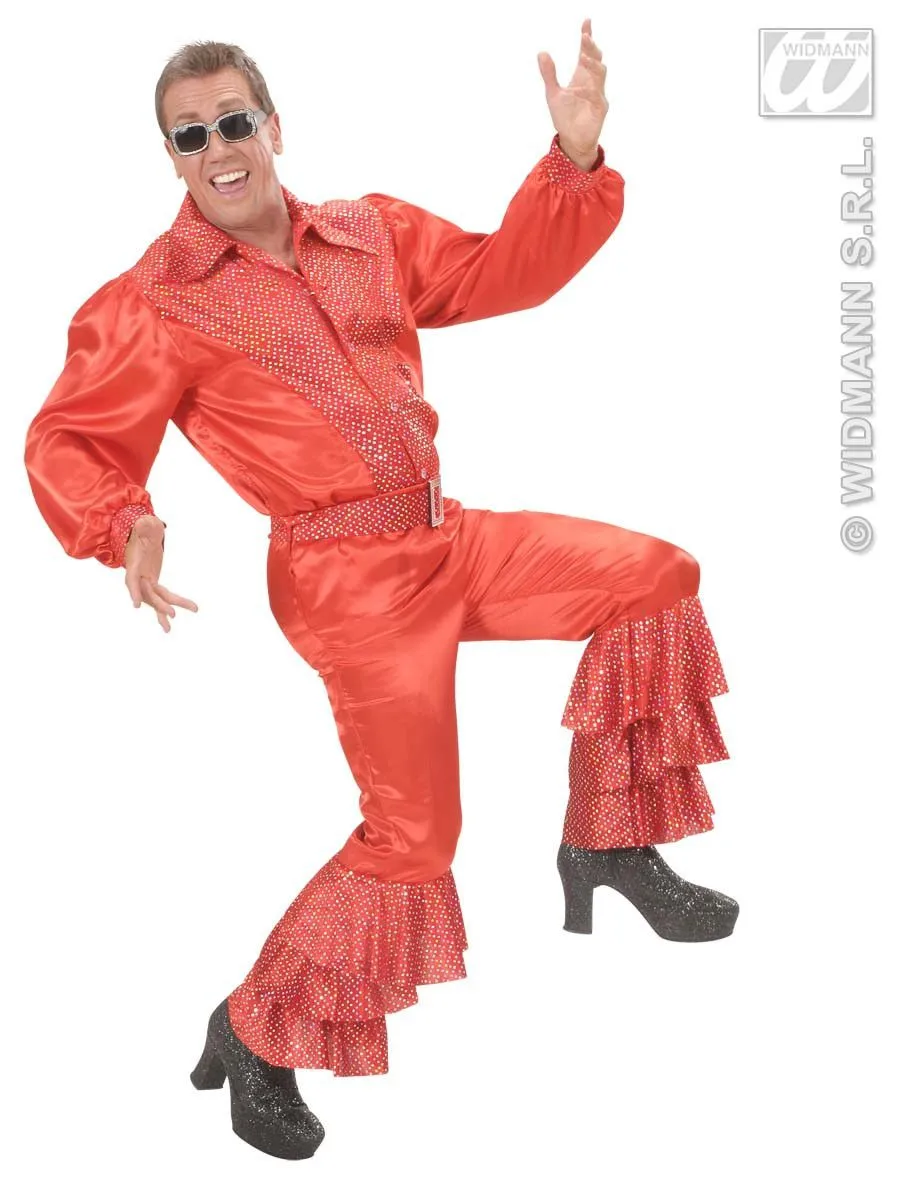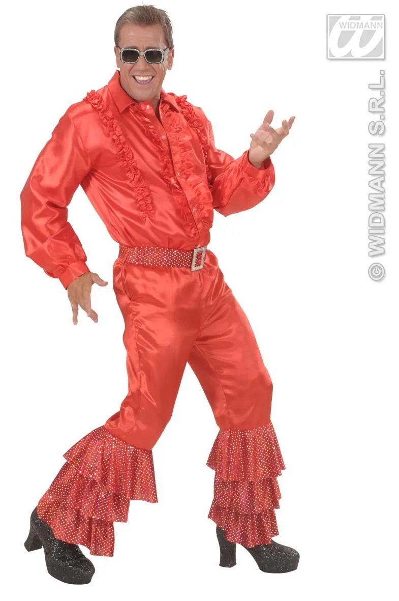 In deze rode broek fluweel met pailletten man kan je er wat van! Want jij staat de hele nacht op de dansvloer in deze stoere jaren 70 kleding. Of is het een jaren 80 kostuum? Ach, wat maakt het uit, als je maar lol hebt!